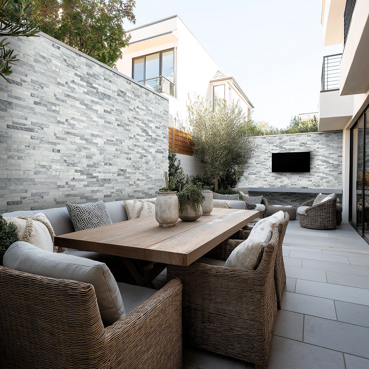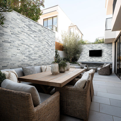 Elevate interiors with natural-look rectangle tiles featuring a refined matte finish and split-face surface.